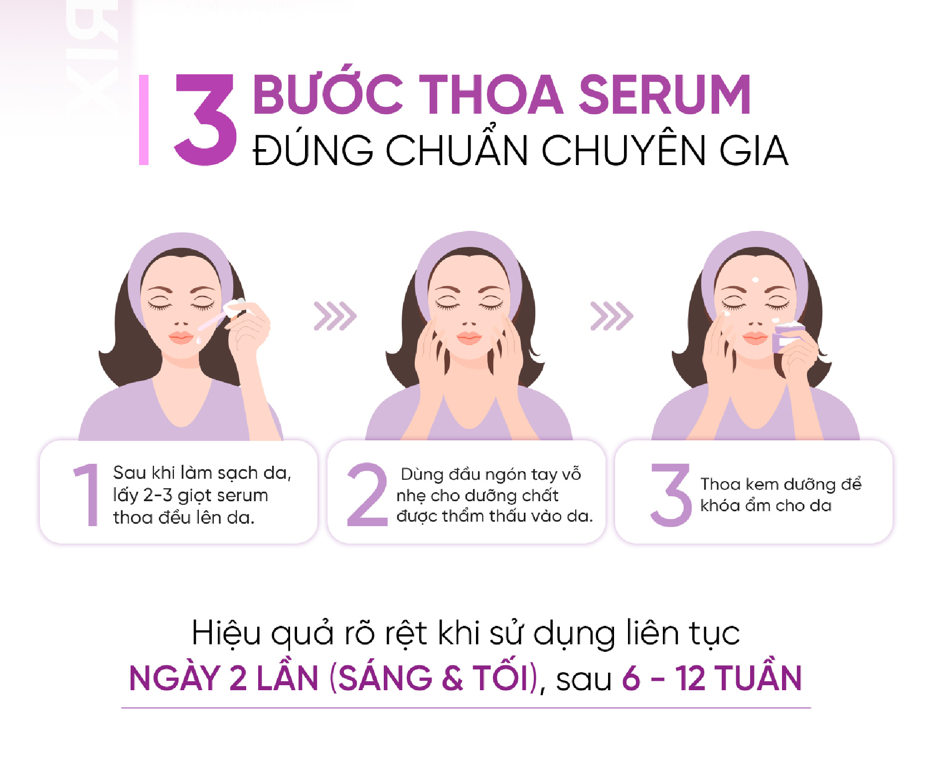 - Sử dụng serum 2 lần mỗi ngày vào buổi sáng và buổi tối sau khi rửa mặt và toner để đạt hiệu quả sau 6-12 tuần.