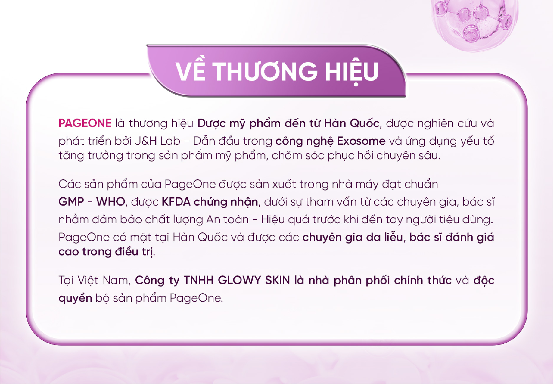 Với sự kết hợp hoàn hảo giữa khoa học và tự nhiên, Page One Matrix Repair Pro + Exosome Serum mang lại giải pháp chăm sóc da cao cấp, được đánh giá cao nhờ khả năng chống lão hóa - làm mờ nếp nhăn hiệu quả đạt chứng nhận Vegan và chuẩn KFDA Hàn Quốc. Serum tập trung vào việc tái tạo làn da, tăng cường độ đàn hồi và mang lại vẻ tươi trẻ rạng rỡ cho làn da chỉ từ 06-12 tuần.