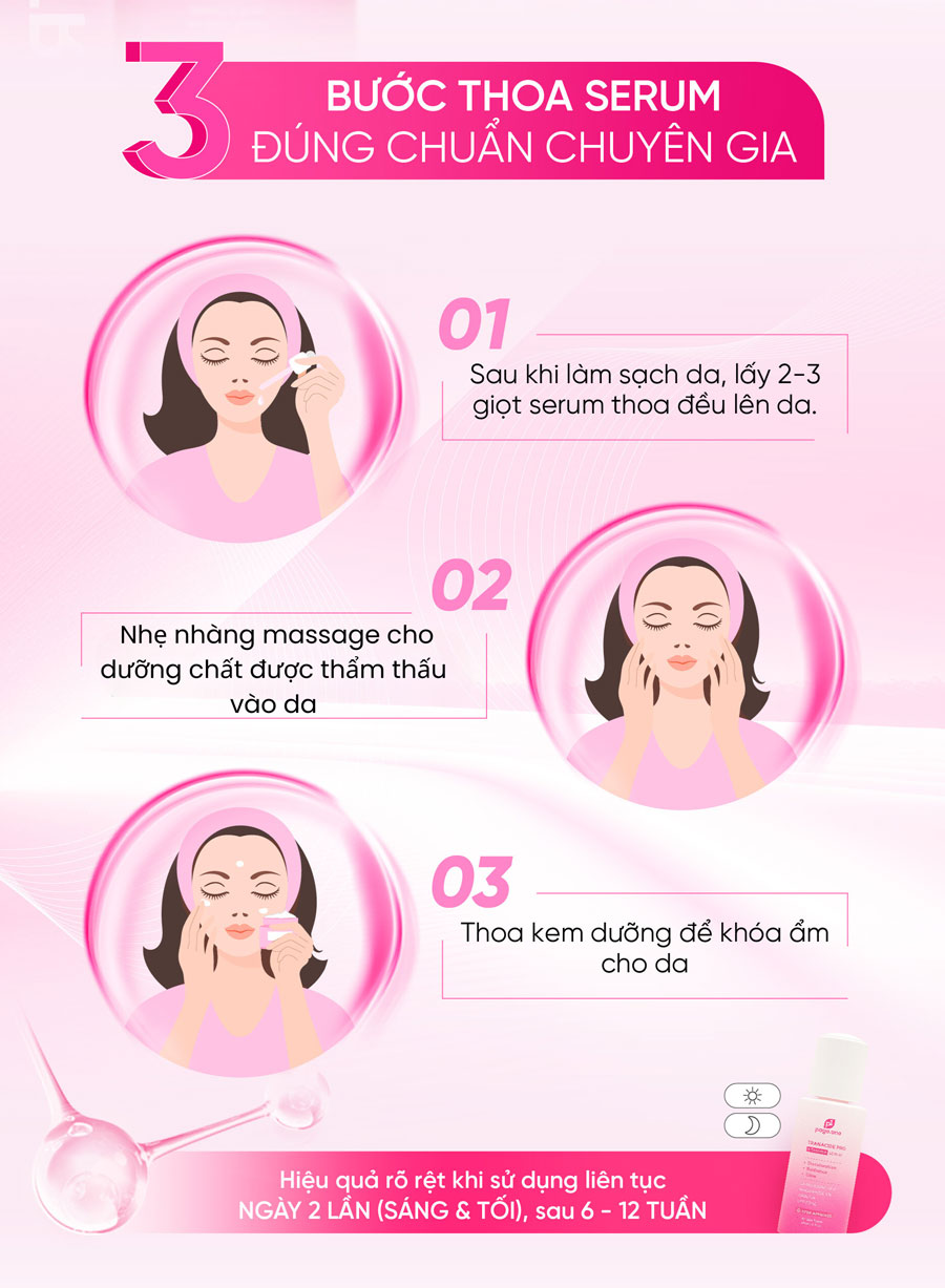 Sử dụng serum 2 lần mỗi ngày vào buổi sáng và buổi tối sau khi rửa mặt và toner để đạt hiệu quả sau 6-12 tuần.