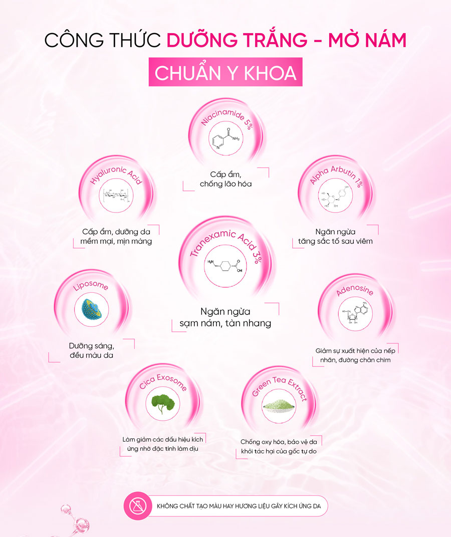 Tranexamic Acid 3%: Hoạt chất hiệu quả trong việc làm sáng và cải thiện sắc tố da. Tranexamic Acid hoạt động bằng cách ức chế hoạt động của enzym plasmin và làm giảm sản sinh melanin giúp làm mờ các vết thâm, sạm và đốm nâu do tác động của ánh nắng mặt trời. Đồng thời, tranexamic acid có khả năng chống viêm, giảm tình trạng sưng đỏ, kích ứng trên da và ngăn ngừa quá trình lão hóa. Ngoài ra, serum cũng hỗ trợ làm mờ các vết thâm do mụn để lại, giúp da đều màu và sáng khỏe hơn.