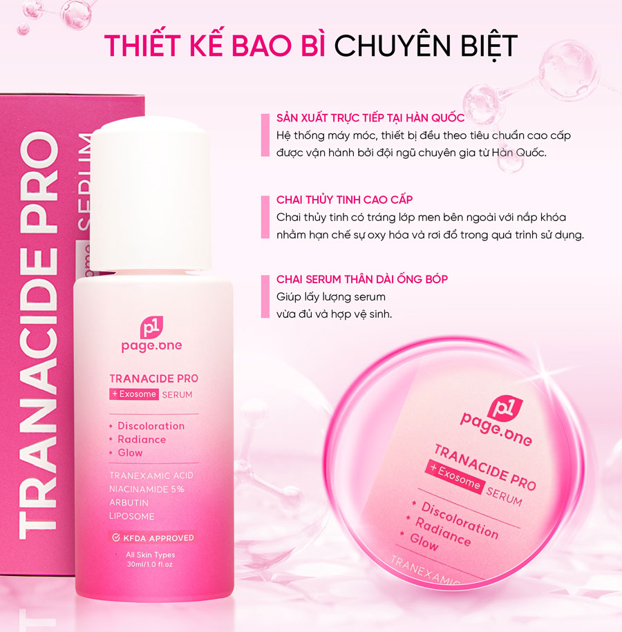 Serum PageOne Tranacide Pro + Exosome là dòng sản phẩm serum điều trị các tình trạng da thâm, sạm, nám được nghiên cứu theo công nghệ tiên tiến chứa bộ ba công thức tranexamic acid, niacinamide, arpha abuitin giúp giải quyết các vấn đề về da như da không đều màu, thâm sạm.