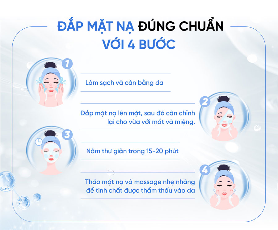 Sau khi cân chỉnh mặt nạ trên mặt, để mặt nạ yên trên da mặt từ 15-20 phút nhằm cho các hoạt chất như Panthenol (Vitamin B5), Niacinamide và Hyaluronic Acid có chứa trong mặt nạ được thẩm thấu, hấp thụ vào da tốt hơn.