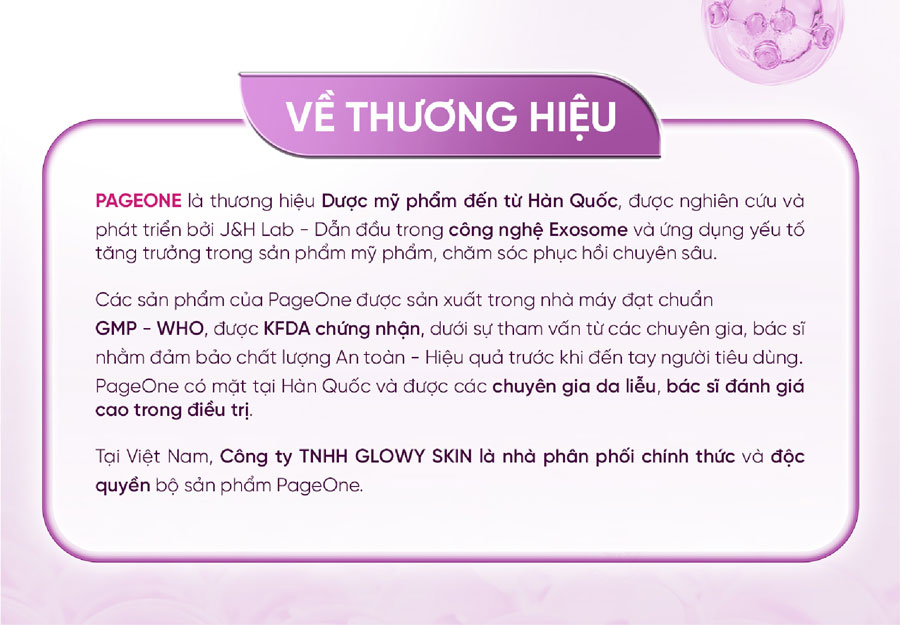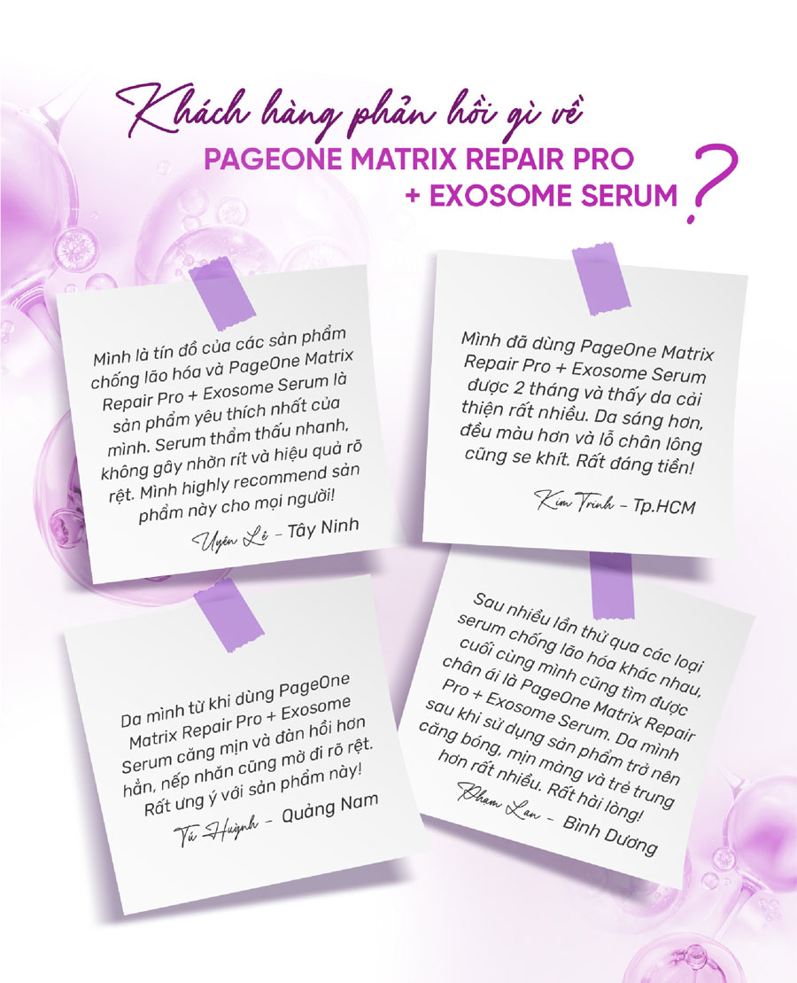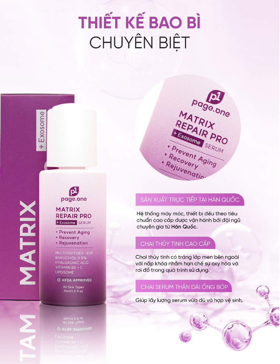 Với sự kết hợp hoàn hảo giữa khoa học và tự nhiên, Page One Matrix Repair Pro + Exosome Serum mang lại giải pháp chăm sóc da cao cấp, được đánh giá cao nhờ khả năng chống lão hóa - làm mờ nếp nhăn hiệu quả đạt chứng nhận Vegan và chuẩn KFDA Hàn Quốc. Serum tập trung vào việc tái tạo làn da, tăng cường độ đàn hồi và mang lại vẻ tươi trẻ rạng rỡ cho làn da chỉ từ 06-12 tuần.