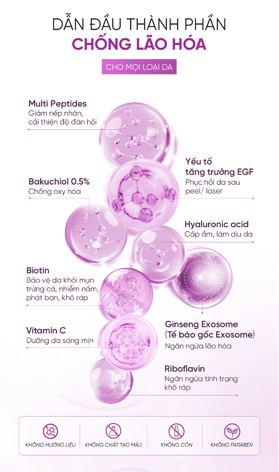 - Không chứa hương liệu, chất tạo màu, không cồn, không paraben.