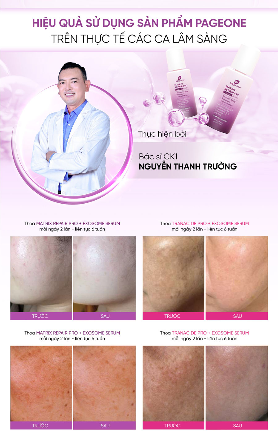 Bác sĩ CK1 - Nguyễn Thanh Trường cho biết "Là một bác sĩ da liễu, tôi luôn tìm kiếm những sản phẩm vừa an toàn, vừa hiệu quả cho làn da của khách hàng. Page One Matrix Repair Pro + Exosome Serum hoàn toàn đáp ứng được những tiêu chí đó. Với thành phần lành tính và công thức độc đáo, sản phẩm này không chỉ giúp cải thiện các dấu hiệu lão hóa mà còn nuôi dưỡng da từ sâu bên trong. Nhiều khách hàng da nhạy cảm cũng sử dụng được mà không gặp bất kỳ vấn đề gì."