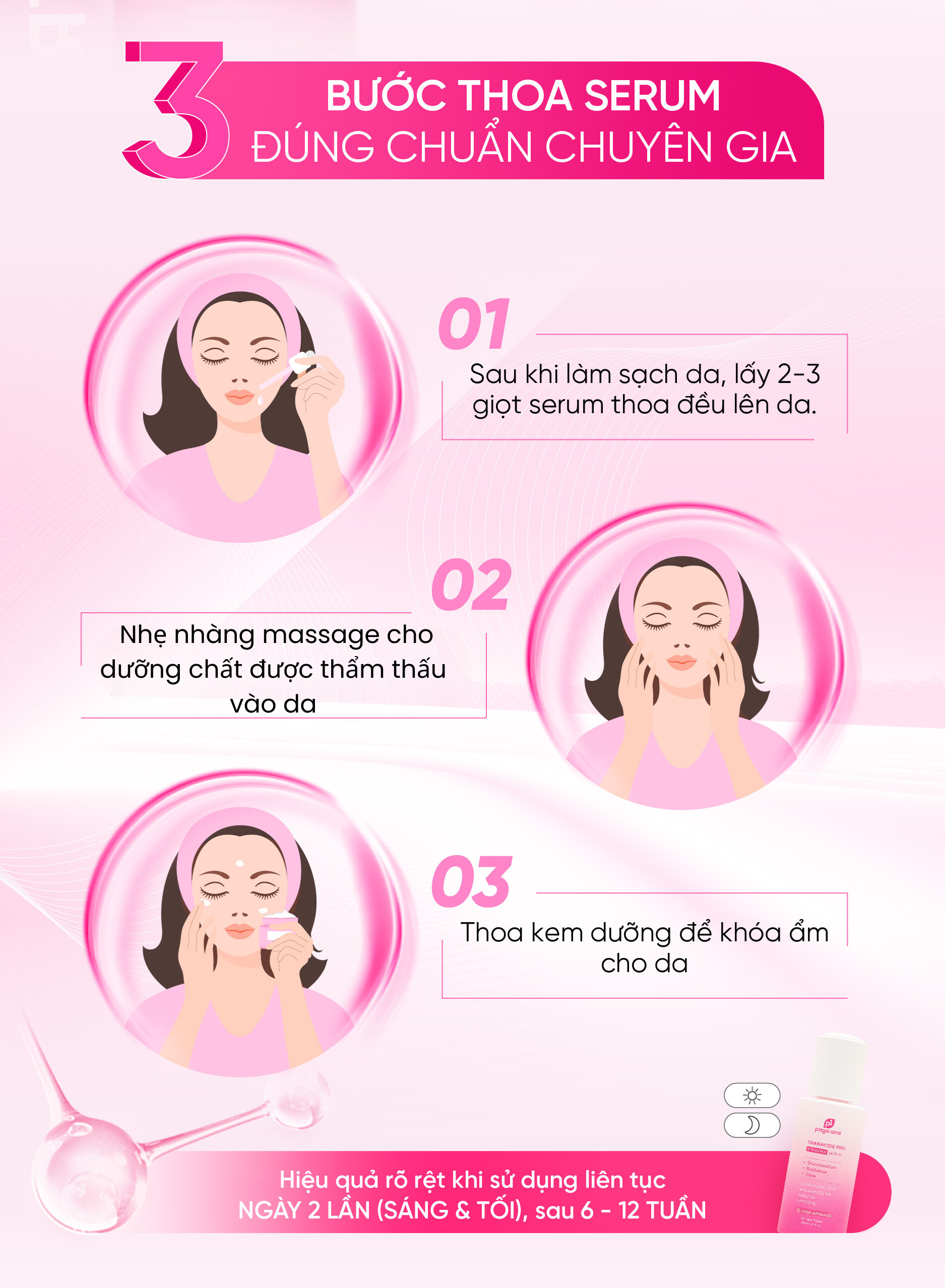 Sử dụng serum 2 lần mỗi ngày vào buổi sáng và buổi tối sau khi rửa mặt và toner để đạt hiệu quả sau 6-12 tuần.